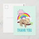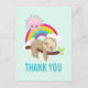 Tarjeta de agradecimiento con una ilustración que presenta un adorable perezoso marrón holgazaneando felizmente en una rama de árbol. Un arcoíris colorido detrás de él junto con un sol rosa sobre su cabeza. Lindo, adorable y trendy.