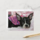Un perrito lindo y cansado de Boston Terrier descansa sobre su nueva cama rosada.