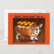 En esta postal se muestra una adorable foto de un perro disfrazado de perrito caliente con el mensaje "¡Que el "dawg se haya ido" divertido en Halloween!". ¡Una forma linda de enviar saludos de Halloween a la familia o amigos!