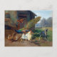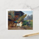 Una postal con la pintura de Carl Jutz (1838-1916), The Dog in the Chicken Coop (1872). Un paisaje colorido con un pavo real, pollos y un perro pardo frente al gallinero de la granja.