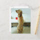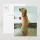 Postal Perro parado en un sofá con un regalo