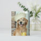 El clima cálido exige una vida fácil, ¡a la manera canina! Esta postal muestra una fotografía de un perro recuperador de oro sonriente, que se está relajando afuera con una bebida fresca y un gorra de paja. El texto del personalizable desea un "¡Feliz verano!"