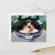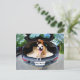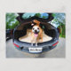 Perros lindos divertidos yendo a dar un paseo en auto moviendo una postal. Adorable que el Chihuahua y la raza mixta de perros. La cita de 'We're Moving' escrita en la placa de licencia puede ser personalizada. Derechos de imagen de Marg Seregelyi Photography.