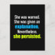 Ella fue advertida. Le dieron una explicación. Sin embargo, persistió. Una fuerte cita que apoya a Elizabeth Warren y sus esfuerzos por permitir que las voces de los demócratas sean escuchadas en el senado. Nunca dejes de creer en el progreso.