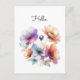 Ilustracion acuático de flores de bonito en verde azulado, melocotón, rosa, violeta, verde. Esta impresión botánica es perfecta para un saludo Hola sencillo, pero puedes cambiar el texto a tu saludo preferido. Gráfico asistido por IA adquirido con uso comercial. Pintura: DreamCafeArt