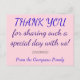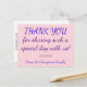 Este sencillo, sencillo y personalizado diseño de tarjetas postales de agradecimiento boda incluye el mensaje "¡GRACIAS por compartir un día tan especial con nosotros!" en la parte delantera, junto con un mensaje de personalizable en la parte trasera. Presenta colores como el rosa y el violeta. Se podría usar para ofrecer gratitud a alguien que fue invitado en una ceremonia de bodas.