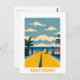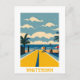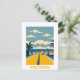 Un ilustracion vibrante y colorido de una escena playera en Ámsterdam, Países Bajos. La imagen cuenta con una playa de arena con sombrillas de colores, palmeras y un paseo marítimo que conduce al océano. A lo lejos se ve un velero y el cielo está lleno de nubes blancas onduladas. El ambiente general es alegre y acogedor.