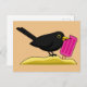 El divertido y simpático personalizado kawaii blackbird comiendo una pala en la playa en un caluroso día soleado de verano. El helado está condimentado con fresa y le gusta mucho.