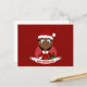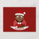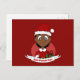 Postal con un ilustracion de una linda sonriente feliz chica negra con el pelo corto, ella está usando el disfraz rojo y blanco de Santa Claus y sosteniendo un regalo; con plantilla de texto editable para tu nombre o mensaje, Navidades diseño de vacaciones con fondo rojo