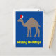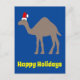 Esta bonita tarjeta postal de Navidades presenta una imagen de arte digital de un lindo camello Dromedary de color marrón con hermosas pestañas largas y una única joroba en su espalda. El camello está vestido para celebrar a los Navidades con un sombrero de Santa Claus rojo y blanco en la cabeza. El camello aparece en la Biblia y es un símbolo tradicional de Navidades. Hay un texto personalizado en la parte delantera para que puedas personalizar tu postal con un mensaje de tu elección. El mensaje predeterminado es Happy Holidays.