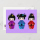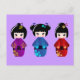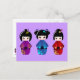 Los kokeshi son muñecas japonesas hechas tradicionalmente para niños, aunque se están volviendo cada vez más populares entre los shinnichi (Japanófilos) y coleccionistas. Se dice que fueron vendidos originalmente a visitantes de aguas termales en la región de Tohoku en Japón durante el periodo Edo (1600-1868), para complementar los negocios y mantener las manos de los trabajadores ocupadas durante los meses de invierno. En este artículo, se ven 3 muñecas kawaii kokeshi lindas sobre un fondo morado.