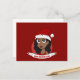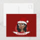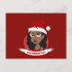 Postal con un ilustracion de una hermosa joven afroamericana con cabello ondulado y el gorra de Santa Claus; con plantilla de texto editable, diseño de vacaciones Navidades con fondo rojo