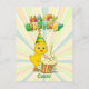 Personalizado de pollo de cumpleaños lindo con ojos azules, gorra de cumpleaños, sosteniendo un quequito de cumpleaños con una vela y un signo de feliz cumpleaños arriba con un fondo de rayos coloridos. Personalizar para cambiar el nombre o eliminar el texto.