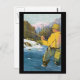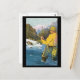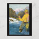 Pescador volador con chaqueta amarilla y botas altas pescando en arroyo de montaña