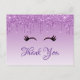 Tarjeta postal de agradecimiento con un diseño elegante y de moda. El fondo es un color gradiente purpura con brillo falso que gotea desde la parte superior. Un par de pestañas lindas y femeninas debajo del brillo.