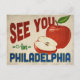 Una encantadora postal de viaje vintage de Filadelfia Pennsylvania con una hermosa manzana roja, junto con un divertido texto de estilo retro que dice: "Nos vemos en Filadelfia".