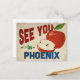 Una encantadora postal de viaje vintage de Phoenix Arizona con una hermosa manzana roja, junto con un divertido texto de estilo retro que dice, "Nos vemos en Phoenix"
