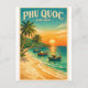 Travel poster featuring Phu Quoc Island, Vietnam, in a classic retro travel-poster style. Central focus on a tropical beach with powdery white sand, clear turquoise sea, gently leaning coconut palm trees, and traditional Vietnamese fishing boats near the shore. In the background, lush green hills and a warm golden sunset over the ocean, creating a peaceful island atmosphere. Vibrant yet balanced color palette of turquoise, emerald green, sandy beige, and sunset orange. Clean graphic illustration with subtle vintage grain texture. Elegant vintage typography: “PHU QUOC – VIETNAM”. Vertical 2:3 layout, high-resolution, print-ready.