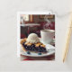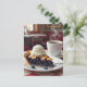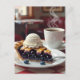 Una postal para mantenerse en contacto con amigos o familiares. En la parte delantera hay un ilustracion de tarta de arándano azul con helado de vainilla derretido y una taza de café caliente en la cena.