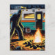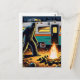 Postal con un ilustracion ai de pie o escotilla colgando de una fogata frente a un viejo retro vintage hecho en un personalizado de historietas hiperrealista.