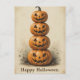 Tres alegres lámparas de jack-o’ apiladas sobre un suave fondo beige hacen esta tarjeta perfecta para los niños o para cualquiera que ame una Halloween clara y feliz!