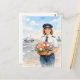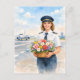 Pilot holds flowers standing on runway Postcard
