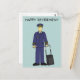 Un piloto personalizado, de pie con una pequeña maleta negra sobre las ruedas, contra un fondo color taupe con las palabras 'Feliz Jubilación' encima de la imagen.
