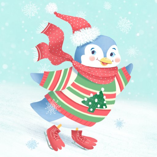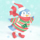 Un Pingüino festivo de invierno se desliza alegremente a través del hielo mientras delicadas copas de nieve caen contra un cielo azul minado! Ilustracion original de Noël Snow.