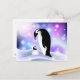 Postal con foto del día del padre con pingüino padre y bebé en una luz del norte y fondo nevado