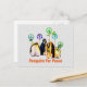 Pingüinos de todas las formas y tamaños sostienen carteles de paz decorados con flores mientras marchan en una protesta por la Paz. El texto dice "Pingüinos por la Paz".