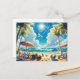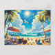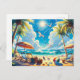 Una vibrante y colorida escena de playa bajo un cielo luminoso y soleado lleno de nubes blancas y gaviotas que se disparan sobre sus cabezas. Las palmeras bordean el primer plano, sus hojas se balancean suavemente en una brisa oceánica. Dos tumbonas están estratégicamente situadas bajo unas amplias sombrillas, a la sombra del sol. La orilla de arena está decorada con varios objetos de playa, como una colorida bola de playa, una estrella y conchas marinas. Las tranquilas olas del océano se desplazan suavemente hacia la playa, reflejando los rayos de oro del sol. Este entorno idílico transmite una sensación de relajación y felicidad veraniega.