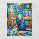 Un gato azul-negro se sienta en el estudio de un pintor rodeado de pinturas coloridas en un ambiente artístico.