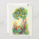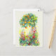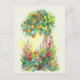 Pintura al acuarela de un naranjo y muchas flores coloridas y vegetación. Un jardín sureño feliz y brillante.