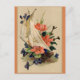 Pintura antigua de un velero de madera con una vela blanca ondulada con paneles azules oscuros y flores de color naranja/coral. Las hojas y los tallos verdes de flores acentúan este dibujo vintage de bonito.