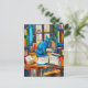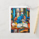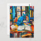 Postal pintura de Gato entre libros abiertos