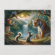 Un entorno forestal sereno donde se encuentra un gran tigre majestuoso entre una variedad de animales, incluyendo ardilla, conejos y pájaros. El tigre mira atentamente a una ardilla que está parada erguida con las patas arriba. A su alrededor, las aves de colores vivos y los mamíferos pequeños se reúnen cómodamente, creando una sensación de armonía y paz. Como telón de fondo, una impresionante cascada se adentra en un tranquilo lago, rodeado por un frondoso follaje y montañas lejanas bajo un cielo suave y brillante.