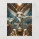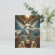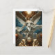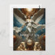 Pintura surrealista de un ángel alado con ropa blanca ondulada entre leones, con una abstracción de bronce del sol y los cielos sobre ella y una ciudad lejana a la distancia de atrás. Elaborado con algoritmos generativos y Photoshop.