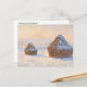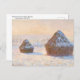 Una postal de arte fino con la pintura de Claude Monet (1940-1926), Wheatstacks - Efecto de Nieve, Morning (1891). Un paisaje cubierto de nieve con pilas de trigo al amanecer.