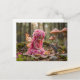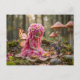 Una mona pixie de pelo rosa con alas marrones y un vestido de flores rosas, disfruta de un picnic en medio del bosque con su amiga, un ratón gris, con árboles y setas como telón de fondo.