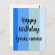 Patrón de rayas azules frescas con texto: Feliz cumpleaños y una plantilla de nombre. Se ajusta a un estilo marítimo.