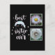 Ilustracion lindo y ondulado con pelo, pestañas, estrellas y dos plantillas de fotos. Haz clic en personalizar para cambiar las imágenes a las de tu hermana (las fotos cuadradas funcionan mejor), o cómpralo tal cual.