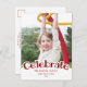 Divertido y único "Celebrar" gráfico de texto en letra curvada roja festiva con plantilla de foto y campos de texto editables. Funciones anteriores que coinciden con el borde rojo con campos de texto editables adicionales.