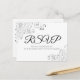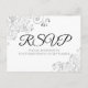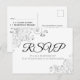 Estas bellas tarjetas postales RSVP le facilitarán a sus invitados responder a su invitación de boda con el número de asistentes y una selección de comidas, o para enviar sus lamentos. El diseño es sencillo pero elegante, con textos en negro y gris y un Relieve metalizado floral de imitación plateado sobre un fondo blanco.