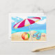 Ilustracion con vistas a la playa con sombrillas y baloncesto