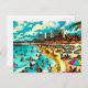 Mantente en contacto con este estilo de arte de cómic pop art con un ambiente vintage. El arte representa a personas divirtiéndose en la orilla de la playa con hoteles y edificios de apartamentos en el fondo, hermosas palmeras, sombrillas coloridas y un cielo nublado azul precioso. Mantente en contacto, di hola y te extraño tarjeta postal de recuerdo.