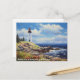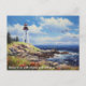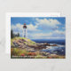 Esta postal ofrece unas impresionantes vistas a un faro en una playa, con una gaviota volando sobre sus espaldas. El faro es alto e imponente, con un exterior de rayas rojas y blancas.