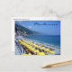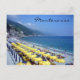Postal de la playa de Monterosso al Mare, Cinque Terre, Italia. Postal de personalizable completo. Monterosso es una ciudad y comunidad de la provincia de La Spezia, que forma parte de la región de Liguria (norte de Italia). Es uno de los cinco pueblos de Cinque Terre. La ciudad está dividida en dos partes distintas: el casco antiguo y la ciudad nueva. Las dos zonas están divididas por un único túnel que acoge a los peatones y a los pocos coches de la ciudad. La playa de Monterosso bordea la mayor parte de la línea costera y está bien utilizada por turistas y lugareños. La playa es la única playa de arena de las Cinque Terre. Monterosso es una pequeña ciudad que en los meses de verano está invadida por turistas.