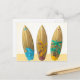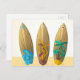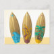 Cuéntanos a tus amigos sobre tus fantásticas vacaciones en la playa con esta postal de surf . Tres tablas de madera retro colocadas juntas en la arena. Los diseños de la tabla de surf incluyen olas azules, delfines y palmeras. Este diseño es fresco, moderno y perfecto para los amantes de la playa, el verano y el estilo de vida de surf.