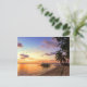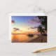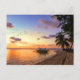 ¡Hermosa puesta de sol de la isla de la playa en esta foto tropical! Casi un color dorado claro en el cielo y en el agua del mar mientras el sol se pone en el horizonte. Un pequeño barco pesquero se encuentra en la orilla de arena, con palmeras tropicales. Tahiti tiene uno de los paisajes más hermosos del mundo con cascadas, volcanes, playas de arena, palmeras exuberantes y aguas tropicales cálidas, perfecto para bucear. La sensación en la foto es tranquila y relajada.