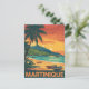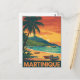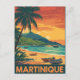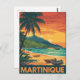 Este impresionante cartel de estilo vintage captura la belleza tranquila de una playa en Martinica. Presenta una escena serena de puesta de sol con palmeras, barcos amarrados en las olas suaves y un paisaje montañoso exuberante en el fondo. Los colores cálidos y ricos y la tipografía clásica le dan el ambiente nostálgico de un anuncio de viaje retro, lo que lo convierte en una pieza perfecta para cualquiera que ame escapadas tropicales y arte vintage.